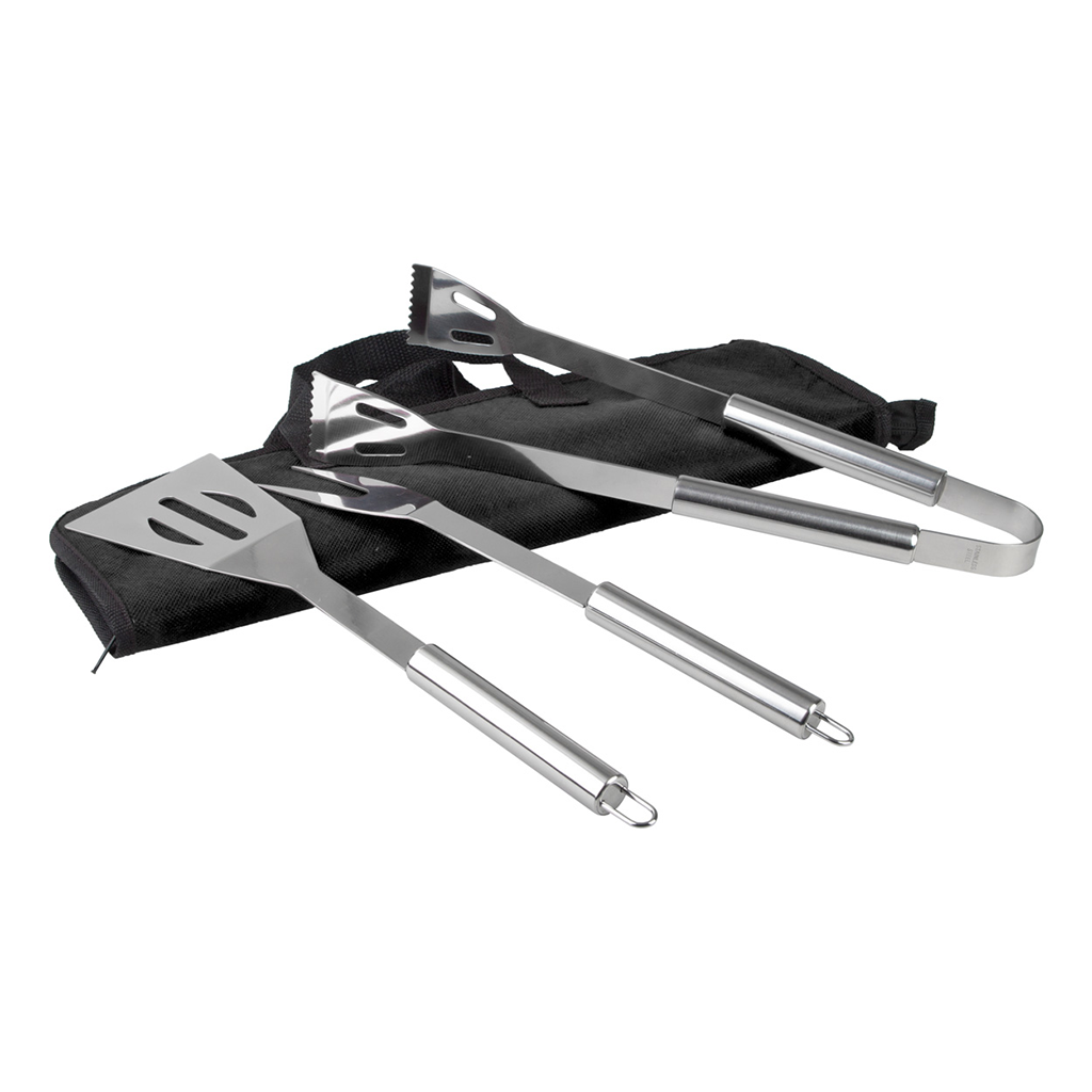Set BBQ da 3 pezzi in acciaio inox. Custodia in nylon con due manici e cerniera.