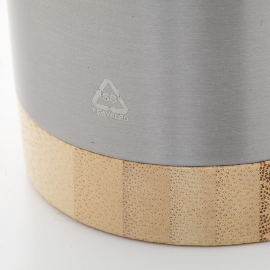 Tazza isotermica da 600ml. a doppia parete, in acciaio inox riciclato con base in bambù e coperchio in plastica AS.