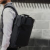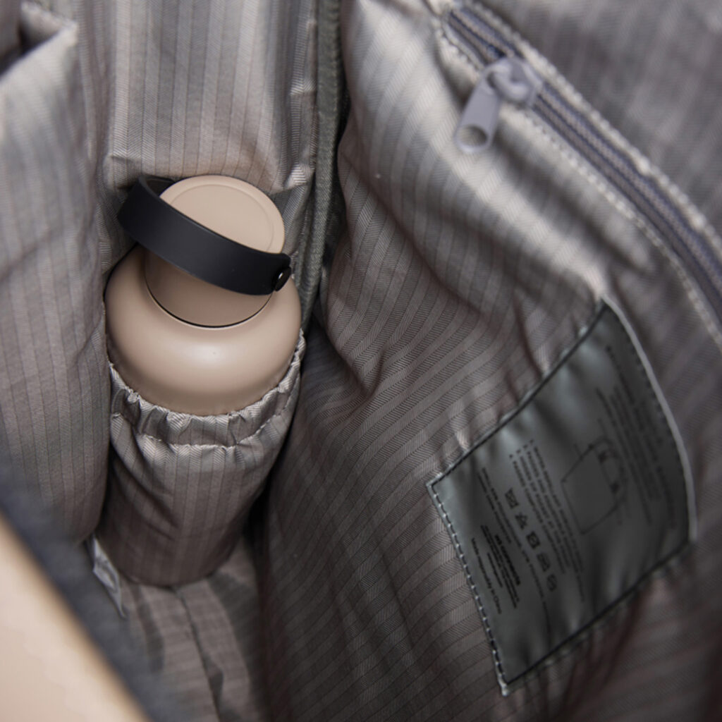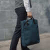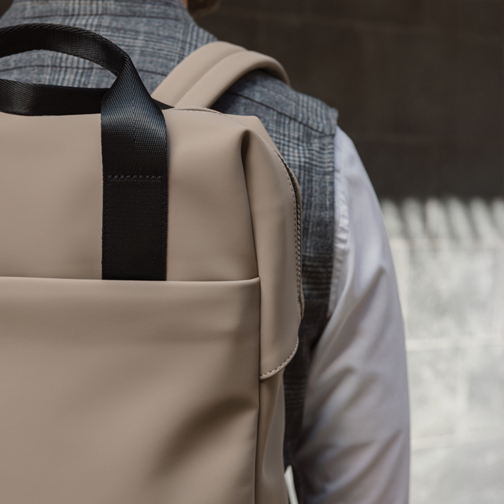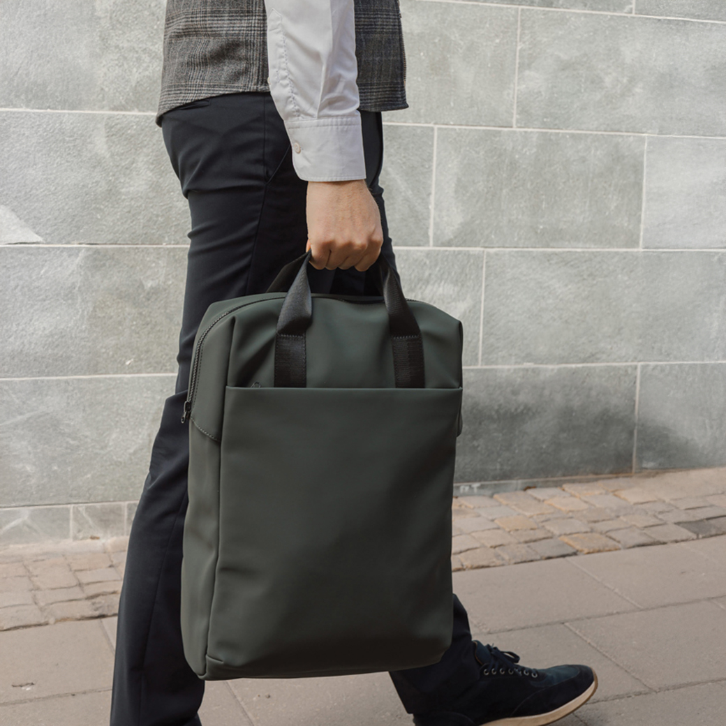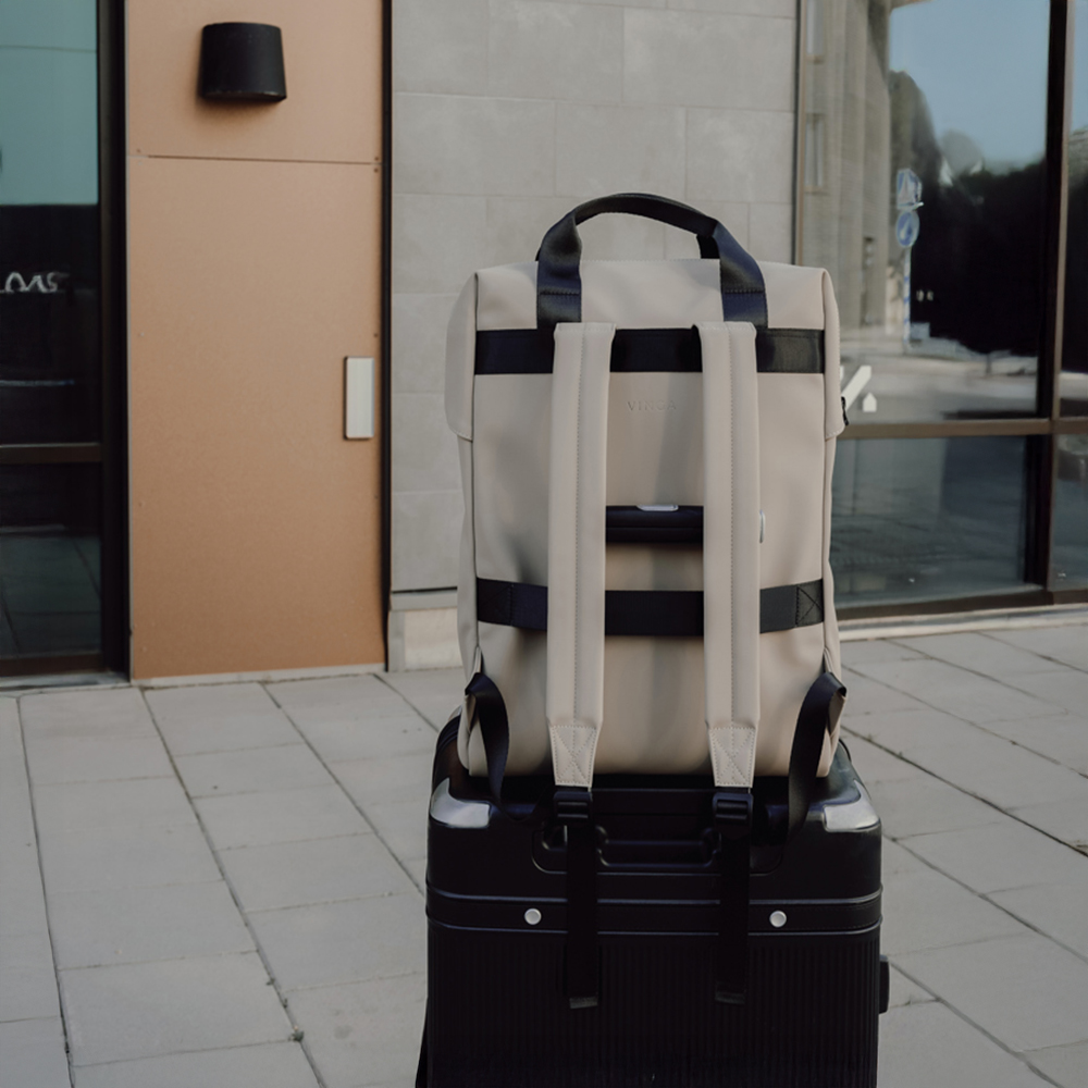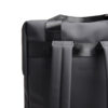 Zaino/borsa dotato di un ampio scomparto per laptop da 16″, una cinghia sul retro per fissaggio al trolley, una grande tasca frontale, una tasca interna e un pratico portabottiglie. Realizzato in poliestere riciclato e PU.